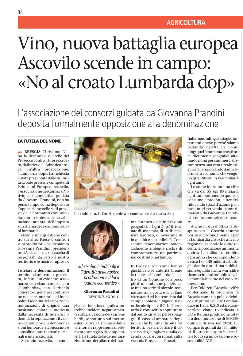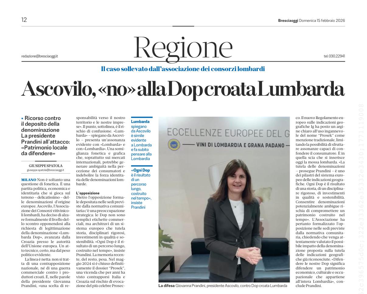 Ascovilo si oppone alla richiesta di denominazione “Lumbarda Dop” della Croazia. Prandini: “Rischio confusione per i consumatori e danno al sistema delle Dop lombarde”