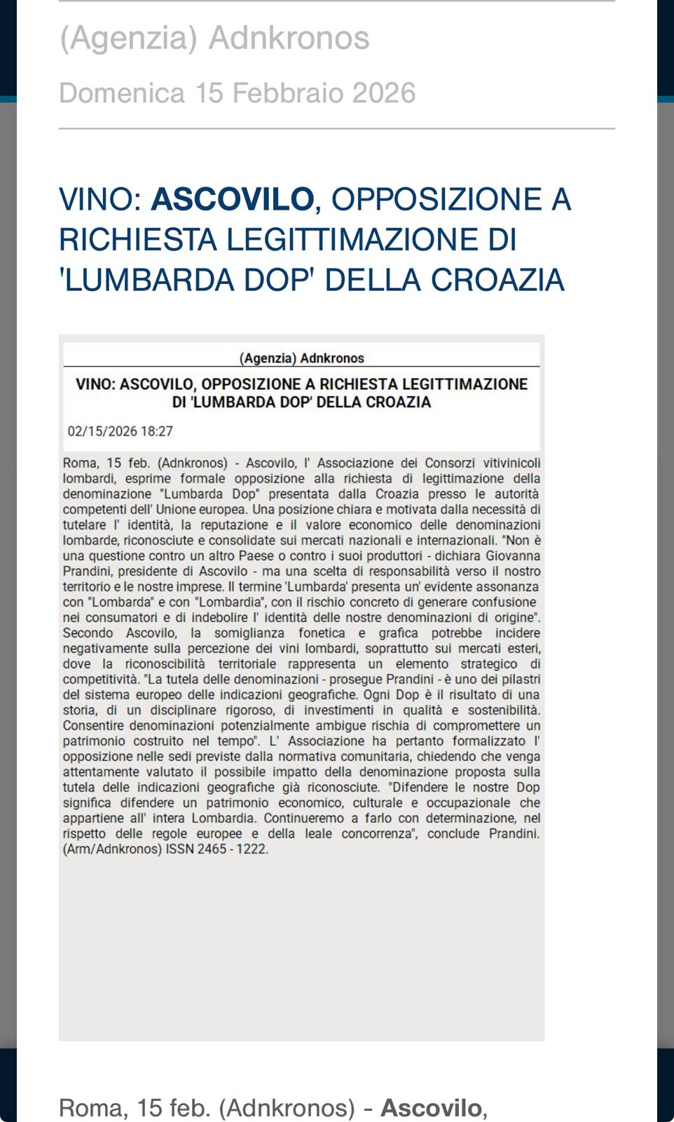 Vino, Ascovilo si oppone alla richiesta di legittimazione della denominazione Lumbarda Dop della Croazia