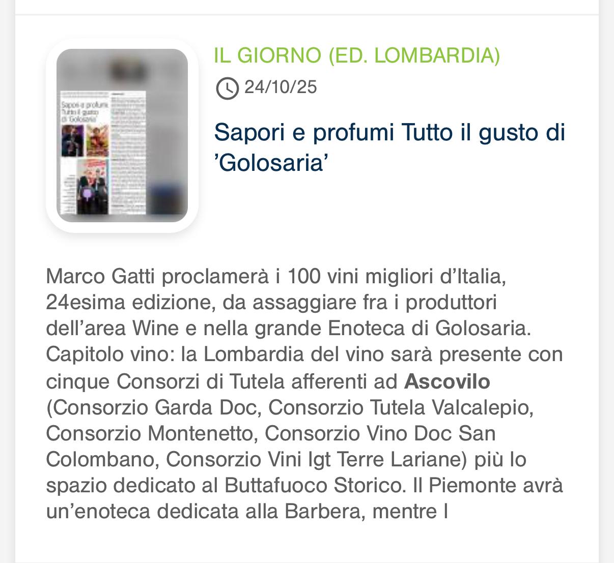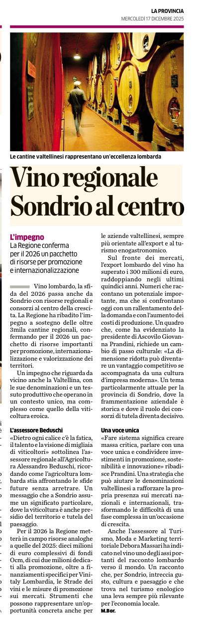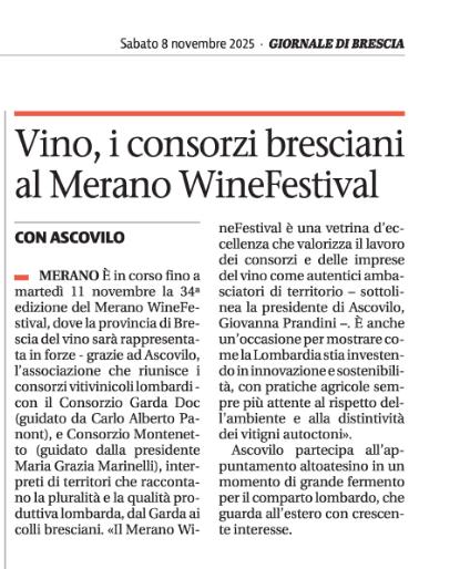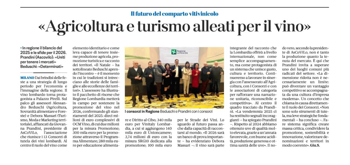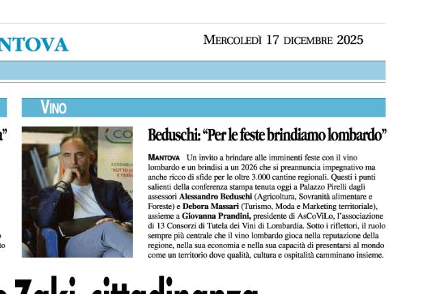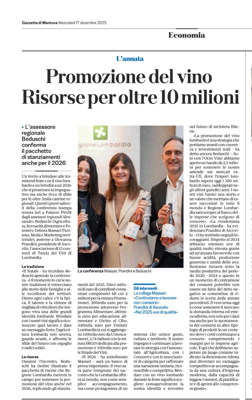 Rassegna 2025 Giovanna Prandini rieletta alla guida di Ascovilo Scopri di più Giovanna Prandini confermata leader di Ascovilo Scopri di più Giovanna Prandini resta alla guida di Ascovilo Scopri di più Giovanna Prandini resta alla guida di Ascovilo Scopri di più Un mantovano tra i vertici di Ascovilo Scopri di più Giovanna Prandini confermata leader di Ascovilo Scopri di più Un mantovano tra i vertici di Ascovilo Scopri di più Giovanna Prandini rieletta alla guida di Ascovilo Scopri di più Primo portale nazionale dedicato al turismo del vino Scopri di più Primo portale nazionale dedicato al turismo del vino Scopri di più Strade dei vini e dei sapori di lombardia Scopri di più Per Ferretti ordine su del 36$ E il riva più grande di sempre Scopri di più Partecipazione oggi alla festa Fim Scopri di più Sapori e Profumi Tutto il gusto di 'Goloseria' Scopri di più Sapori e Profumi Tutto il gusto di 'Goloseria' Scopri di più Strade dei vini e dei sapori, alla guida Gianni Bosselli La ricerca sulle imprese preentata da Guidesi Scopri di più Le strade del vino alleate per raccontare i territori Scopri di più Opere strategiche senza fondi: 84 milioni cercasi Scopri di più Taglio del nastro per "Colline in bolle" più di 80 etichette in degustazione Scopri di più Taglio del nastro per "Colline in bolle" più di 80 etichette in degustazione Scopri di più Tradizione e Trasformazione Le trattorie coi "Tre Gamberi" Scopri di più I vent'anni di Golosaria nel piatto, nel bicchiere e in una mostra Scopri di più Golosaria a Milano Rho formassi e vini orobici Scopri di più Golosaria a Milano Rho Gruppo 121 Formaggi e vini orobici Scopri di più Golosaria a Milano Rho Formaggi e vini orobici Scopri di più Vent'anni di Golosaria la fiera che celebra il gusto della contemporaneità Scopri di più Vent'anni di Golosaria la fiera che celebra il gusto della contemporaneità Scopri di più Merano Wine Festival: il made in BS è protagonista Scopri di più Merano Wine Festival: il made in BS è protagonista Scopri di più Vino, i consorzi bresciani al Merano WineFestival Scopri di più Vino, i consorzi bresciani al Merano WineFestival Scopri di più Vini bresciani protagonisti al Merano Wine Festival Scopri di più Vini bresciani protagonisti al Merano Wine Festival Scopri di più Vino, i ricavi crescono del 2% soffrono le aziende medio-piccole Scopri di più Vino, i ricavi crescono del 2% soffrono le aziende medio-piccole Scopri di più Villagio di Natale tra pattini e sapori Scopri di più «L'agricoltura nel futuro con le nuove generazioni» Scopri di più L'Intelligenza artificiale in campo per la sicurezza Premio a Perla del Garda Scopri di più L'Intelligenza artificiale in campo per la sicurezza Premio a Perla del Garda Scopri di più «Ai» e sicurezzain campo, premio europeo a Perla del Garda Scopri di più Beduschi: "Per le feste brindiamo lombardo" Scopri di più Dieci milioni per sostenere i produttori di vino lombardi Scopri di più Promozione del vino Risorse per oltre 10 milioni Scopri di più «Agricoltura e turismo alleati per il vino» Scopri di più Vino, dalla Regione 15 milioni di euro per la promozione Scopri di più Vino regionale Sondrio al centro Scopri di più